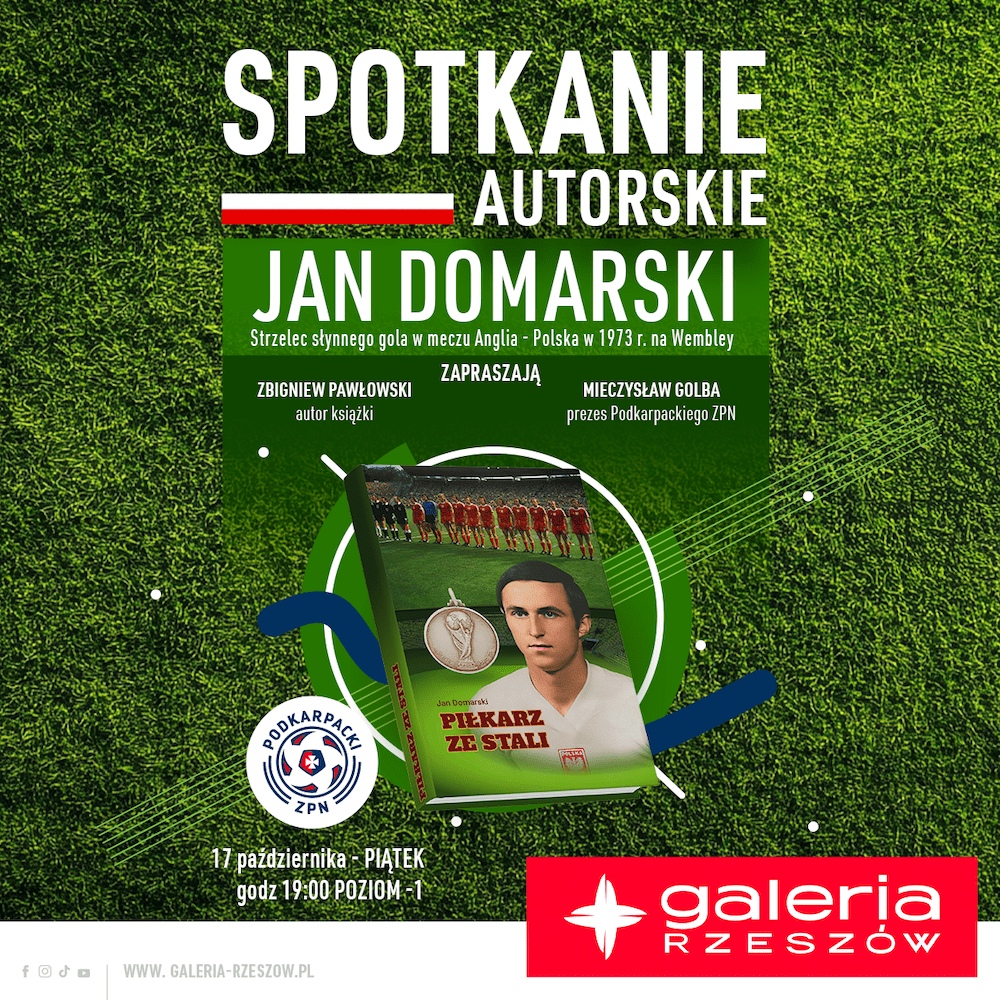 W piątek, 17 października 2025 r., o godzinie 19:00, w Galerii Rzeszów (Poziom -1, Al. Piłsudskiego 44) odbędzie się spotkanie autorskie poświęcone nowej książce, pt. „Jan Domarski. Piłkarz ze Stali”. Wydarzenie organizowane jest przez Podkarpacki Związek Piłki Nożnej.