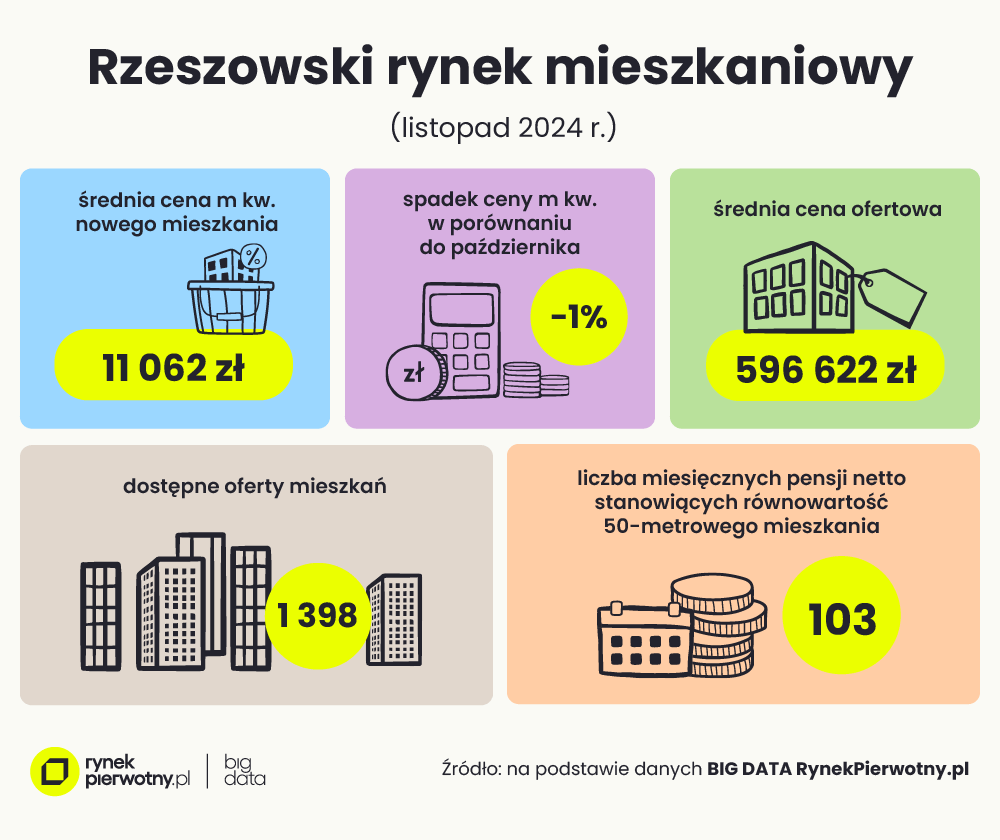 Według analizy serwisu RynekPierwotny.pl średnia cena metra kwadratowego nowych mieszkań w Rzeszowie rosła gwałtownie do maja tego roku. W kolejnych dwóch miesiącach nastąpił jej spadek, a następnie stabilizacja. Co ciekawe, w listopadzie cena za m kw. zmniejszyła się o 1 proc. i aktualnie wynosi średnio 11 062 zł w wypadku nowego mieszkania.