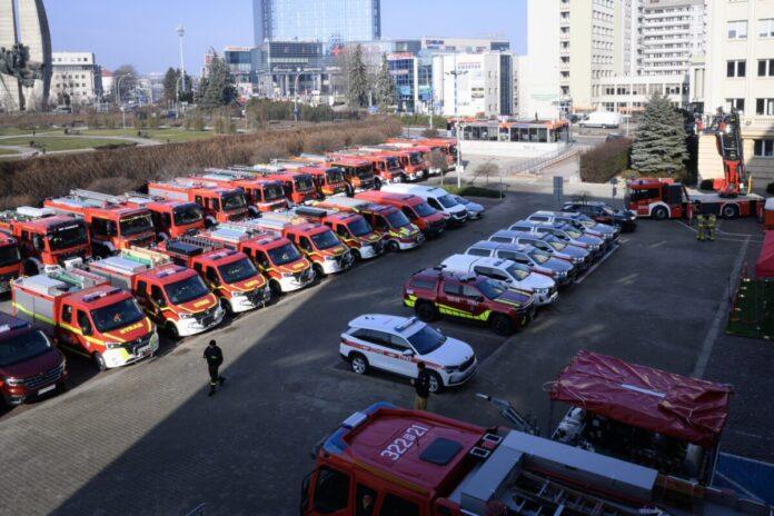 Wśród przekazanego w środę sprzętu było m.in. ponad 20 samochodów ratowniczo-gaśniczych różnego typu, samochód z 30-metrową drabiną, kilka aut rozpoznawczo-ratowniczych, osiem mikrobusów do przewozu strażaków oraz urządzenie do dekontaminacji pojazdów.
