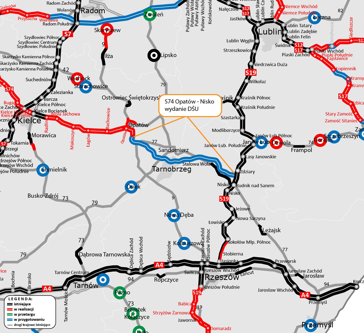 Odcinek na terenie województwa łódzkiego jest w przygotowaniu, a dalsza część na terenie województwa świętokrzyskiego do Opatowa – w realizacji. Jak przekazała rzeczniczka świętokrzyskiego oddziału GDDKiA Małgorzata Pawelec-Buras, pierwszym odcinkiem S74 w województwie świętokrzyskim, Kielce – Cedzyna, o długości 6,8 km, można jeździć już od 2012 r.