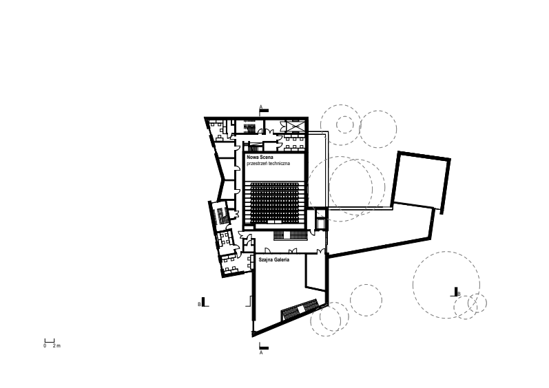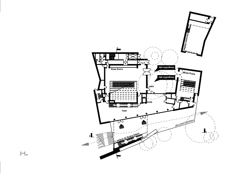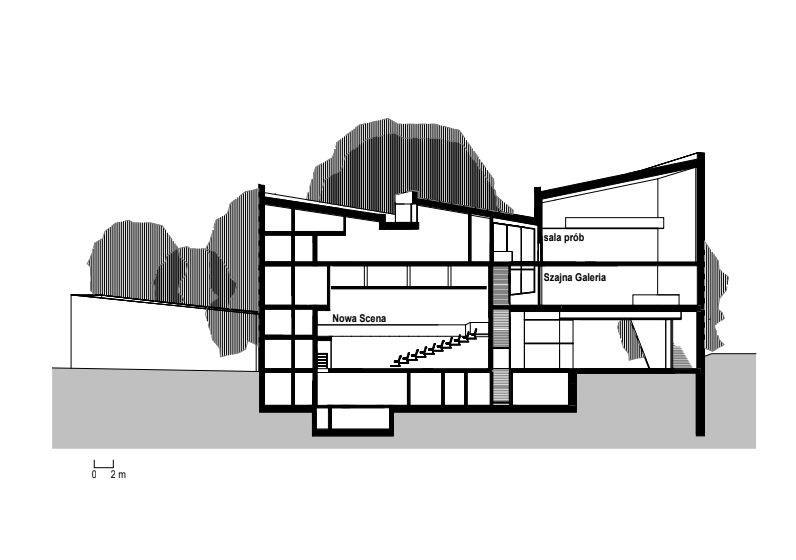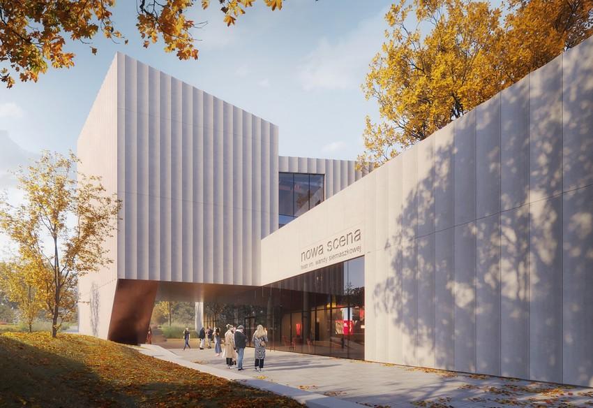 Nowa Scena to zespół dwóch budynków: głównego obiektu teatralnego oraz osobnego magazynu dekoracji. Co ciekawe, w centrum głównego budynku zaprojektowano podłużne, przeszklone foyer z widokiem na patio i zachowaną zieleń. Ta przestrzeń ma łączyć najważniejsze funkcje parteru, czyli prowadzić do dwóch sal teatralnych, kawiarni oraz wejścia do przestrzeni wystawienniczej. Projekt zakłada powstanie dwóch scen: większej typu black box nazwanej „Nową Sceną”, która mieści 180 osób, oraz mniejszej – „Młodej Sceny” dla 60 widzów. Co ciekawe, obie wyposażone są w nowoczesne systemy technologii scenicznej i zaprojektowane tak, by umożliwić różne konfiguracje przestrzeni i aranżacji wydarzeń.