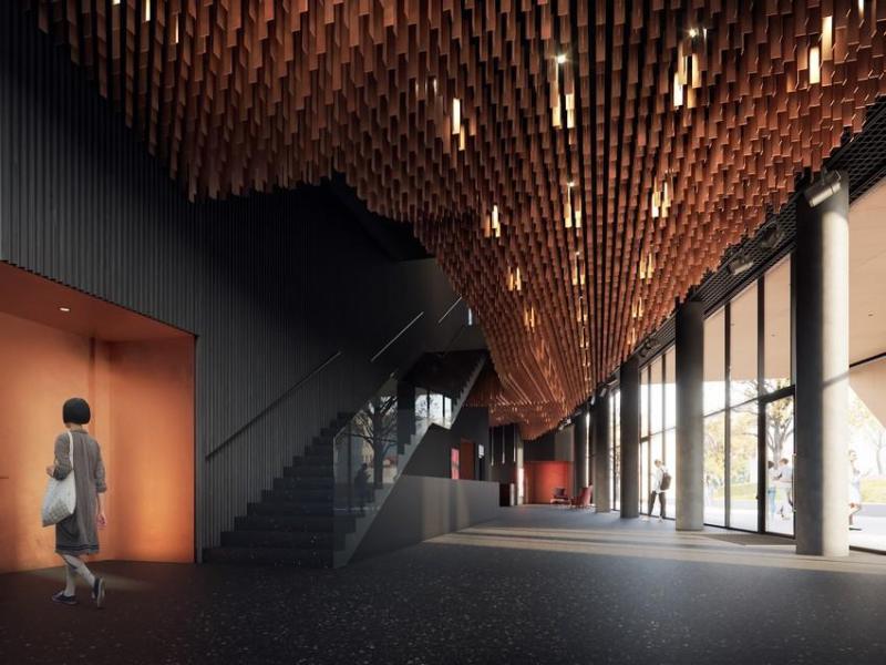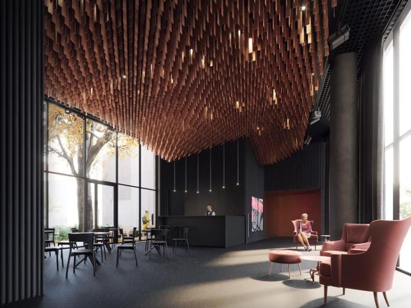 – Głównym akcentem jest sufit foyer z nieregularnych, miedzianych lamelek, który subtelnie modeluje przestrzeń i nadaje jej niepowtarzalny charakter – mówi współautorka projektu.