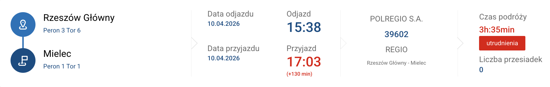 System wskazuje na opóźnienie rzędu 130 minut, co oznacza, że przewidywany przyjazd szynobusu do Mielca nie nastąpi szybko. Sami pasażerowie po godzinie oczekiwania pojechali dalej zastępczą komunikacją autobusową.