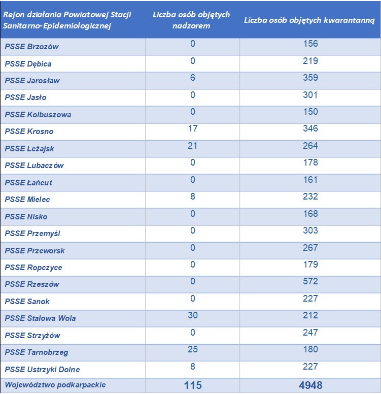 Wśród nowych zakażeń trzy stwierdzono na Podkarpaciu, a dokładnie w Rzeszowie. To dwie kobiety i mężczyzna w „sile wieku”. Jak poinformował dr Adam Sidor, szef podkarpackiego sanepidu, wszyscy zakażeni są w „ścisłej izolacji”.