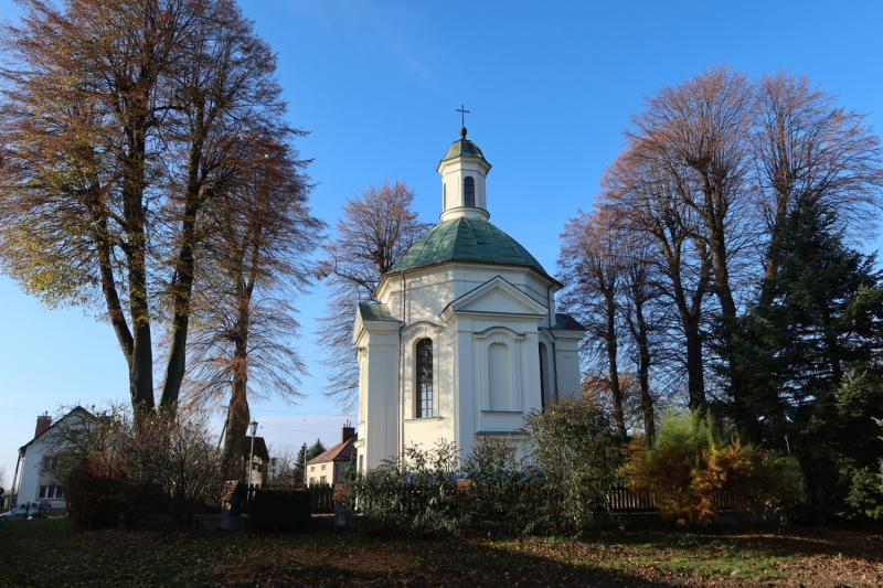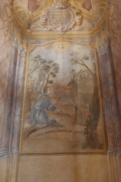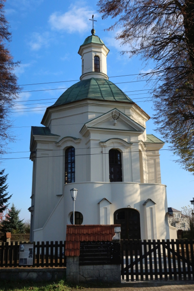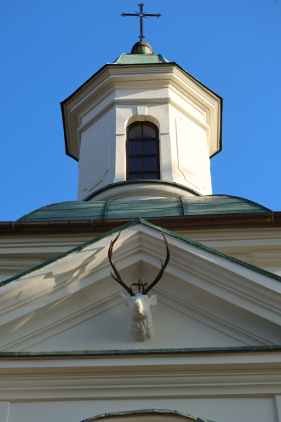 Jest to dwupiętrowa budowla centralna, na planie równoramiennego krzyża greckiego z wysoką ośmioboczną kopułą, zwieńczoną ośmiobocznym dachem. Całość zakończona jest latarenką, wpasowaną w kształt bryły, z czterema wysmukłymi oknami. Każde z ramion krzyża, zaznaczone w elewacji zewnętrznej, jako niezbyt długi ryzalit, zakończony niskim, trójkątnym naczółkiem. Wnętrze świątyni jest zdobione bogato freskami, w tym przedstawiającymi św. Huberta. Do wyposażenia wnętrza świątyni należy niewielki ołtarzyk z wizerunkiem Madonny z dzieciątkiem.