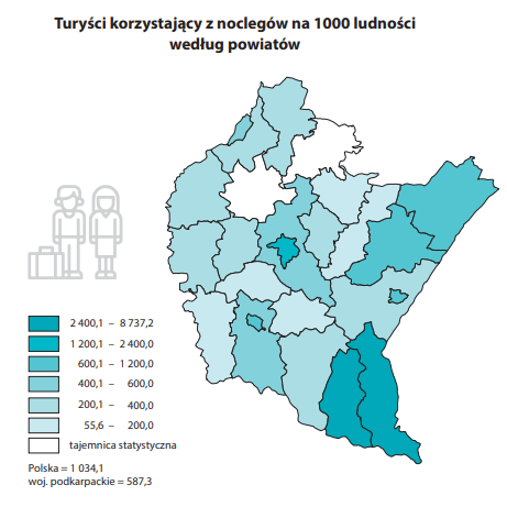 Na 1000 mieszkańców województwa podkarpackiego przypadło średnio 587,3 turystów korzystających z noclegów, podczas gdy średnia krajowa wyniosła 1034,1.