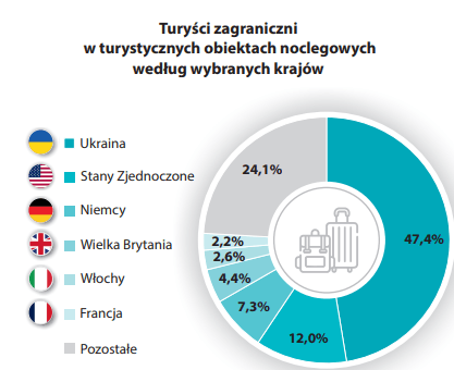 Okazuje się, że najwięcej gości zagranicznych przyjechało z Ukrainy (47,4 proc.), co może być związane z konfliktem, jaki ma miejsce za naszą wschodnią granicą. Kolejne miejsca zajęli turyści z: