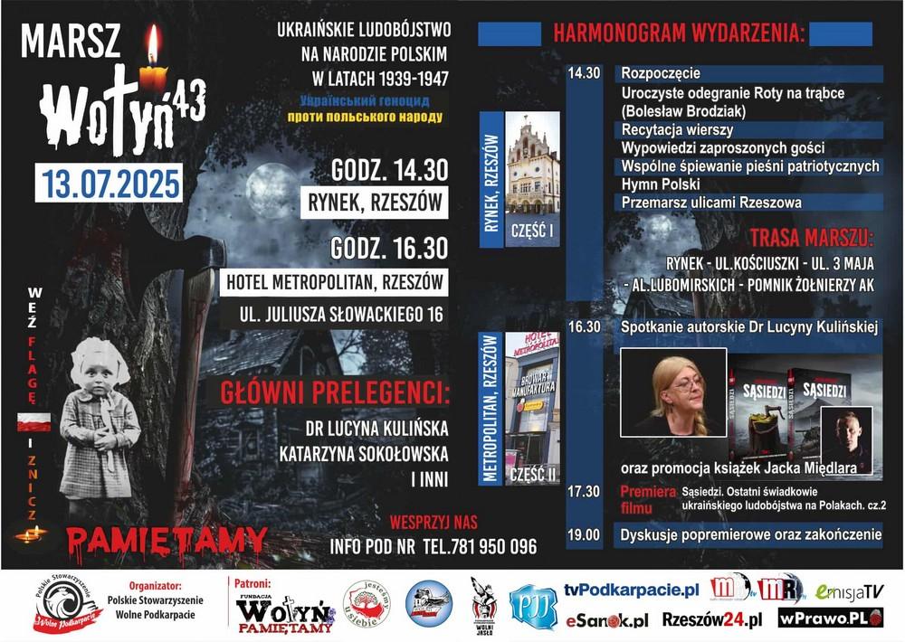 Ulicami Rzeszowa przejdzie Marsz Wołyń ’43 – wydarzenie upamiętniające ofiary ukraińskiego ludobójstwa na narodzie polskim w latach 1939–1947. Uczestnicy spotkają się na Rynku, by oddać hołd pomordowanym i przypomnieć o tragicznych kartach historii Kresów Wschodnich.
