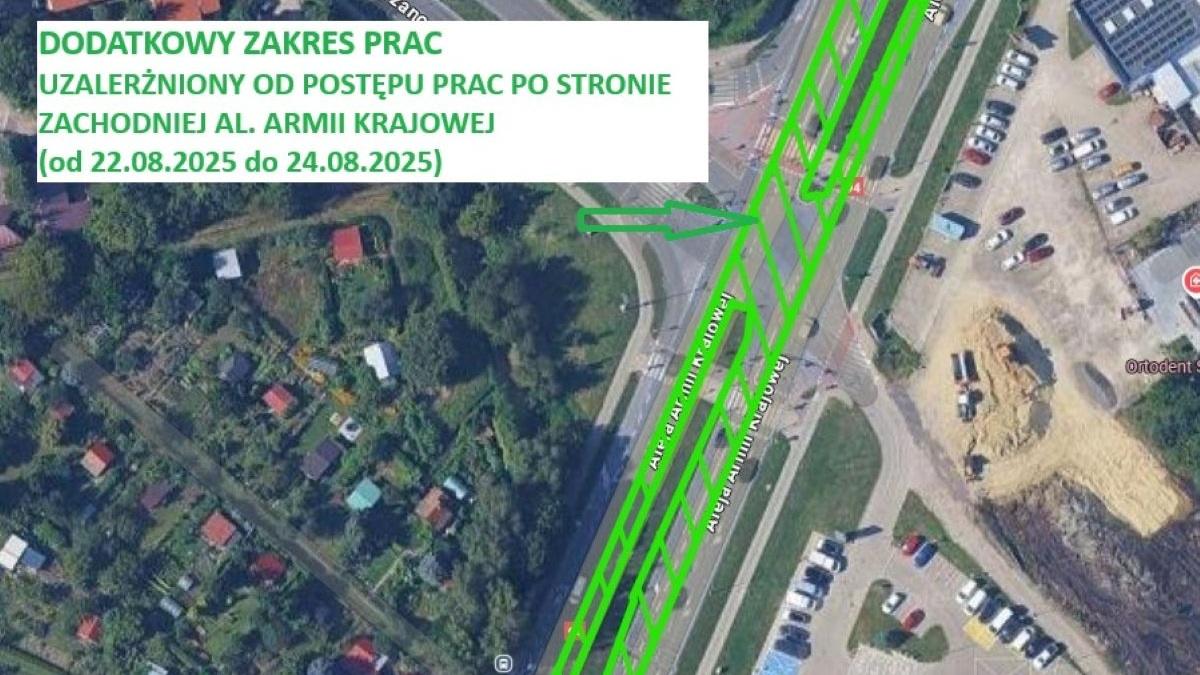 Od piątku (22 sierpnia) do godz. 18 zmieni się organizacja ruchu na tym skrzyżowaniu. Miasto zamknie prawy pas Armii Krajowej w kierunku północ-południe. Dodatkowo kierowcy nie przejadą ul. Krzyżanowskiego w rejonie wyjazdu na Armii Krajowej.