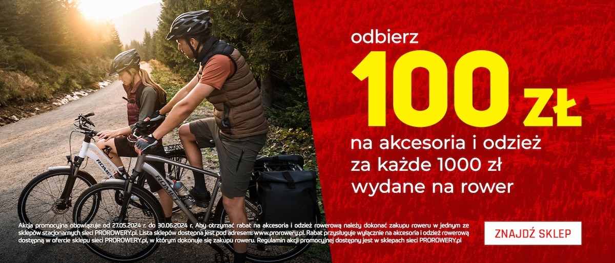 • do 30 czerwca można skorzystać z dogodnej promocji „Kup rower i odbierz 100 zł na akcesoria za każde 1000 zł wydane na rower” – to świetna okazja do wyposażenia roweru w niezbędne akcesoria, które zapewnią wygodę, bezpieczeństwo i ułatwią podróżowanie (oferta skierowana jest wyłącznie do klientów salonów PROROWERY.pl).
