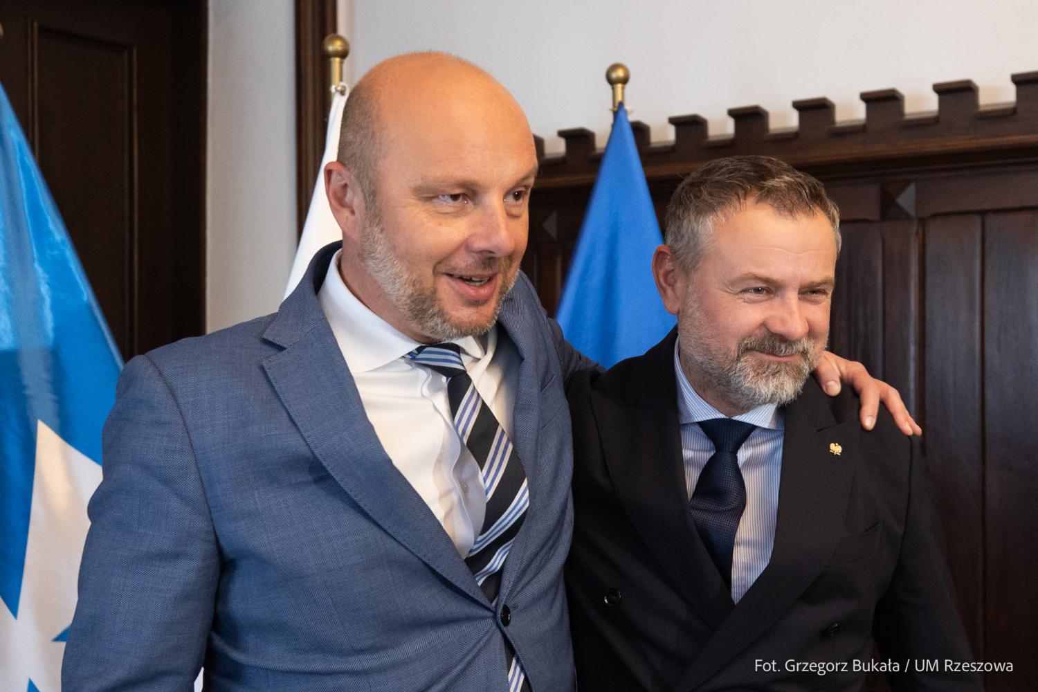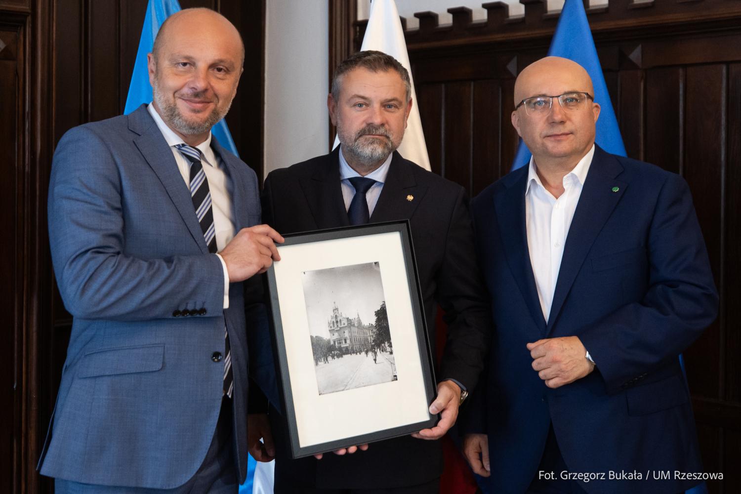Na pożegnanie prezydent Rzeszowa wręczył Grzegorzowi Wronie pamiątkową fotografię – biało-czarne zdjęcie ratusza oprawione w ramkę.