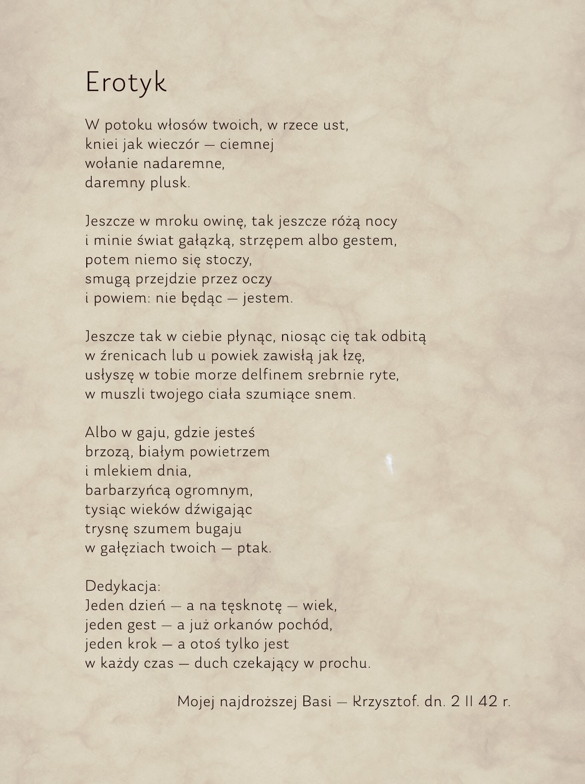 Poznali się na tajnych kompletach polonistyki Uniwersytetu Warszawskiego. On – dwudziestoletni, niewysoki, z burzą jasnych włosów. Ona – dziewiętnastoletnia, zakochana w poezji, marząca o karierze krytyka literackiego. Ich miłość rozwinęła się błyskawicznie – tydzień po pierwszym spotkaniu Krzysztof poprosił Basię o rękę, a po sześciu miesiącach byli już małżeństwem.