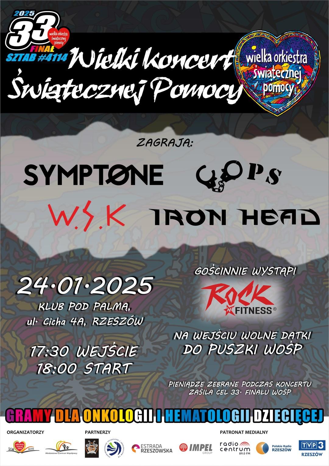 Cops, Symptone, W.S.K. oraz Iron Head oraz Rock’n’Fitness, licytacje i świetna zabawa czekają na was w rzeszowskim klubie Pod Palmą. Już dziś odbędzie się tam Wielki Koncert Świątecznej Pomocy w ramach 33. finału WOŚP. Zamiast biletu – datek.