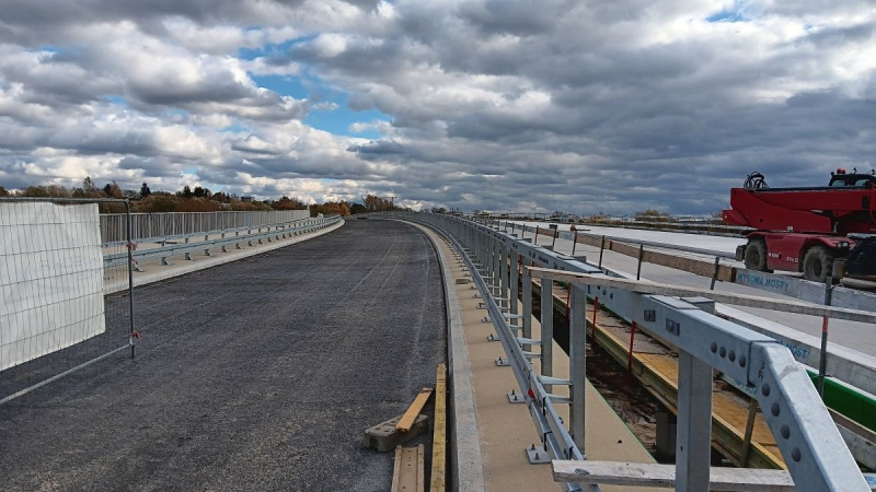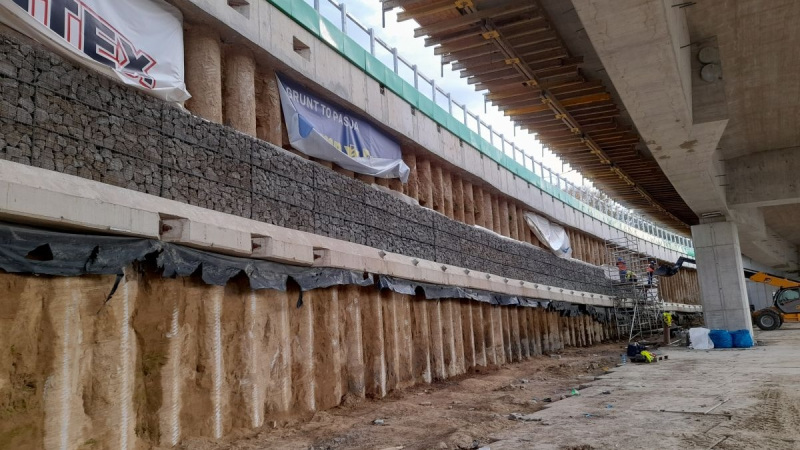Konstrukcja obu jezdni jest zabetonowana i sprężona. Na prawej jezdni wykonano kapy, żywiczną nawierzchnię, bariery i balustrady, a także izolację i warstwę wiążącą. Na lewej zabetonowano kapy i rozpoczęto hydroizolację płyty. Dojazdy do estakady mają już pierwsze warstwy drogi. Mur oporowy przy ul. Konfederatów Barskich ma żelbetowy oczep, a front oblicowano koszami siatkowo-kamiennymi.