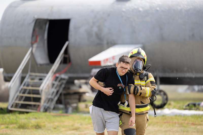 Ćwiczenia na lotnisku zaskoczyły realizmem – poszkodowanych odegrali studenci ratownictwa medycznego z rzeszowskiej uczelni. Zadbano o profesjonalną charakteryzację ran i wiarygodne urazy medyczne poszkodowanych.