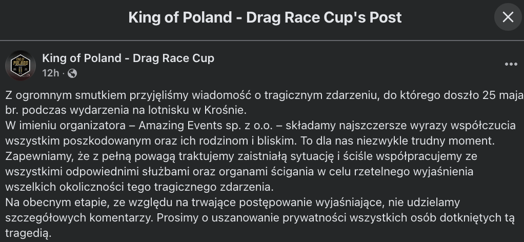 Regulamin „King of Poland – Drag Race Cup” wskazuje, że uczestnicy (kierowcy i widzowie) biorą udział w imprezie „dobrowolnie i na własną odpowiedzialność”. Co więcej, dokument podkreśla, że „organizator nie ponosi odpowiedzialności za wszelkie urazy, których uczestnicy mogli doznać podczas trwania zawodów”.