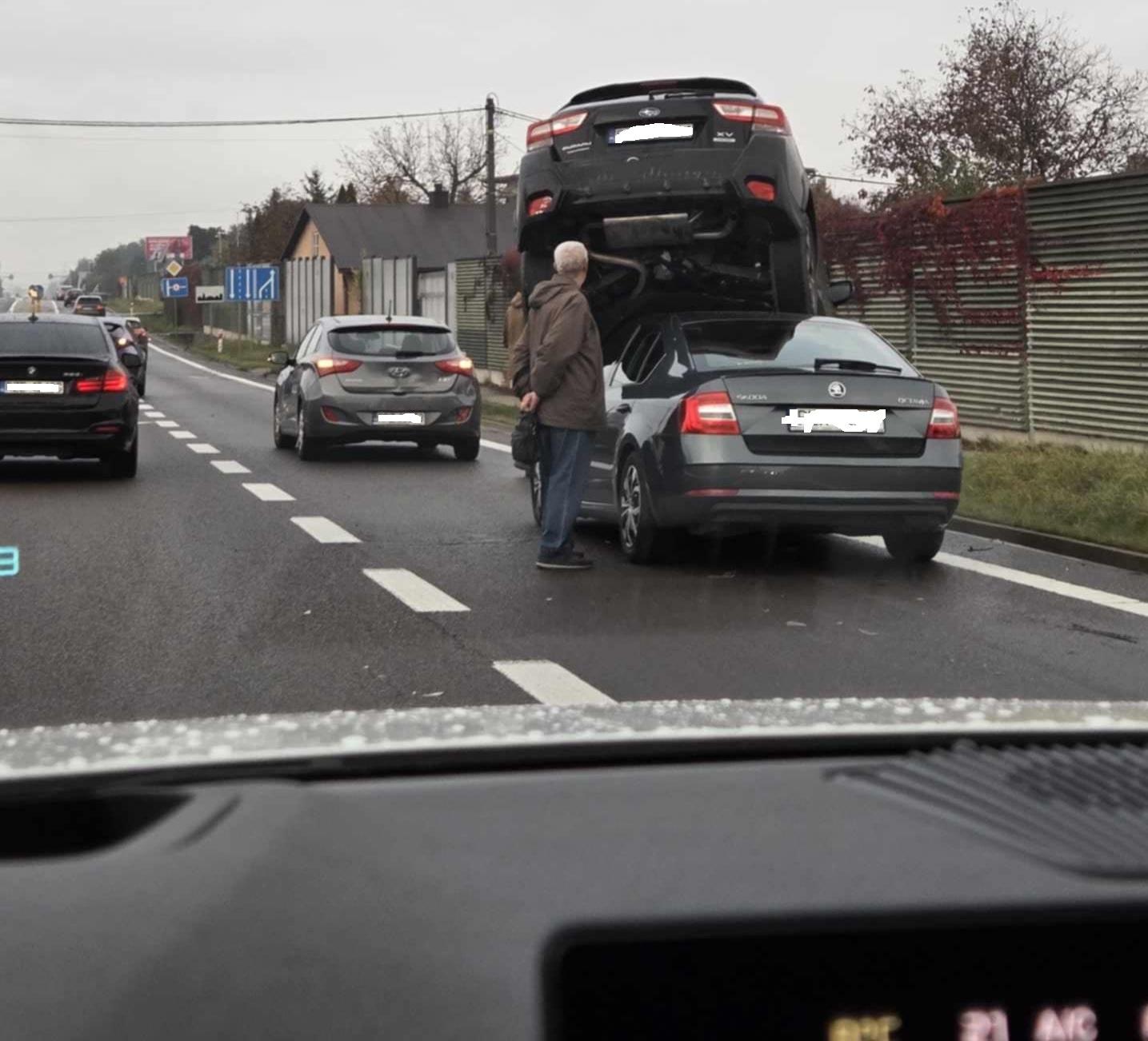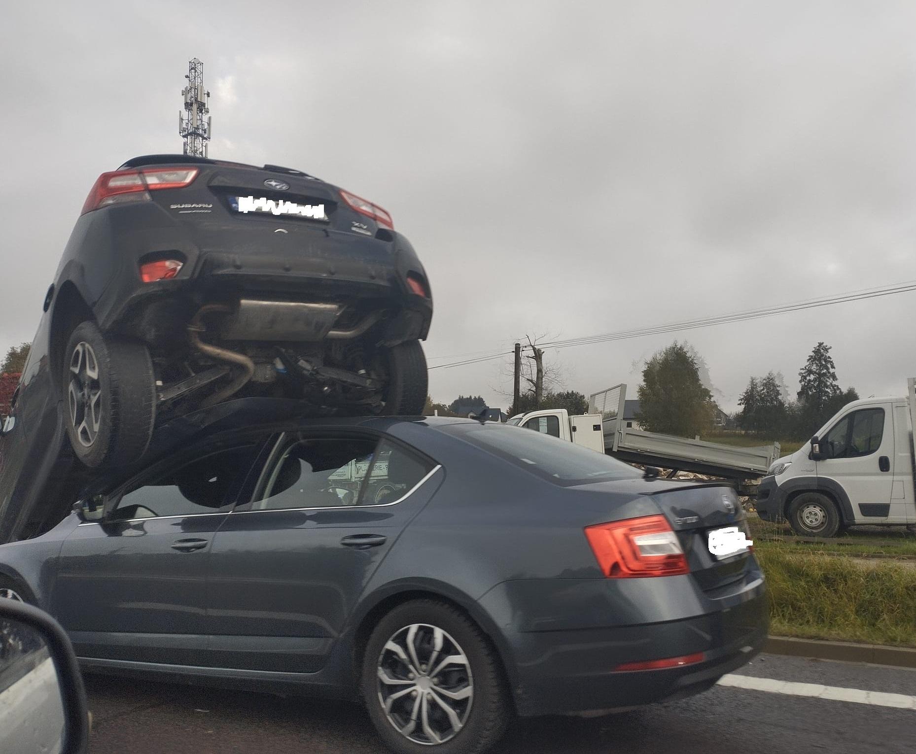 Na zdjęciach widzimy, że nie była to zwykła kolizja. Skoda musiała z dużą siłą uderzyć w tył subaru, który prawie w całości znalazł się na jej dachu.