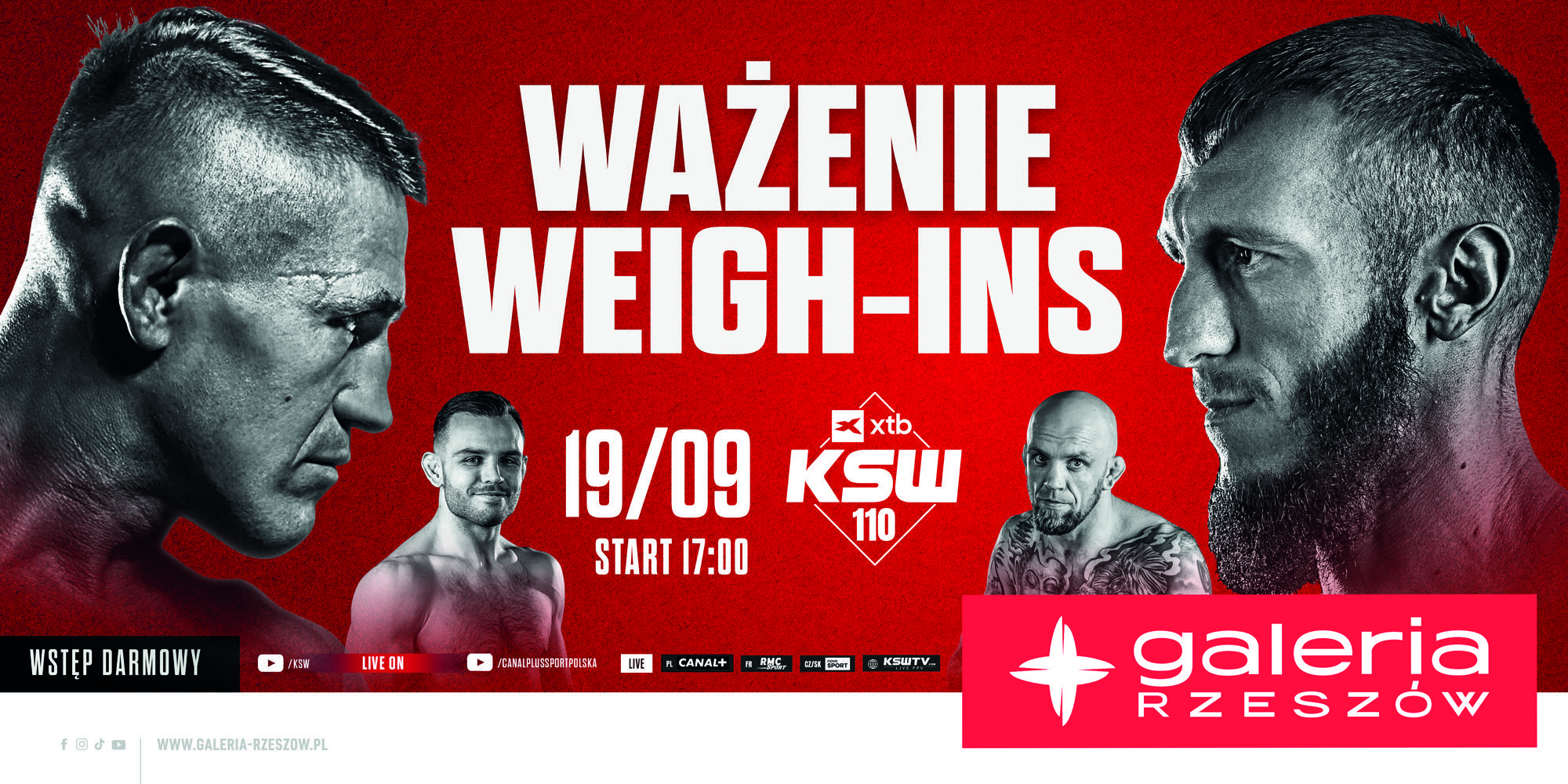 Piątkowe wydarzenie w Galerii to przedsmak gali: Strefa Fana, Q&A, trening pokazowy i wejścia na wagę z bliska, w świetle kamer i przy dopingu publiczności. Całość będzie też transmitowana na żywo na kanale YouTube/KSW. Dla kibiców to rzadki moment, by zobaczyć face to face i dostać autografy jeszcze przed sobotnią walką główną. Strefa Fana o 17:00, Q&A o 18:00, trening o 18:45, ważenie o 19:00. Wstęp jest wolny.
