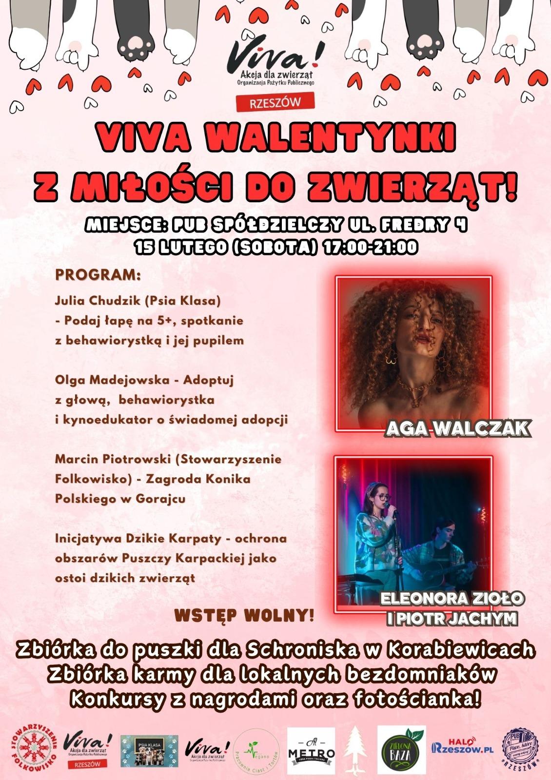 Rzeszowska grupa Fundacji Viva organizuje „Walentynki – z miłości do zwierząt”. W ramach wydarzenia odbędą się m.in. wykłady, szkolenia, koncerty oraz zbiórka karmy. Event ma charakter charytatywny, a wstęp jest wolny.