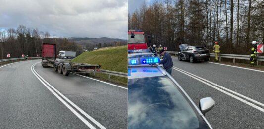 Zderzenie ciężarówki z mazdą na DK19. Naczepa wpadła w poślizg