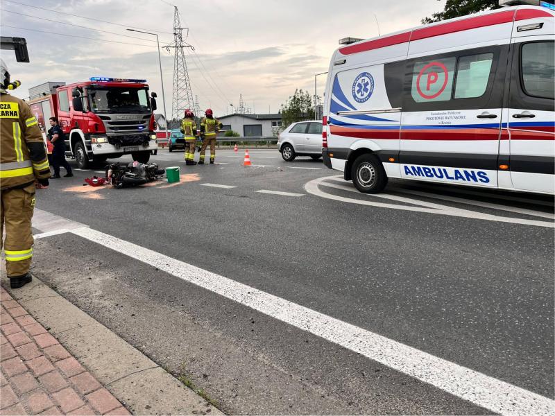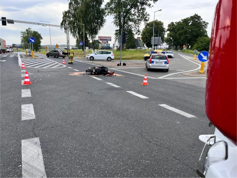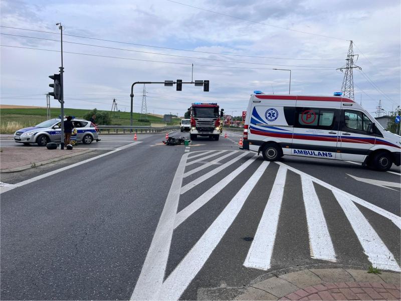 Na skutek odniesionych obrażeń, kierujący skuterem wymagał pilnej pomocy medycznej. Po zaopatrzeniu przez ratowników został on przewieziony do szpitala na dalsze badania.