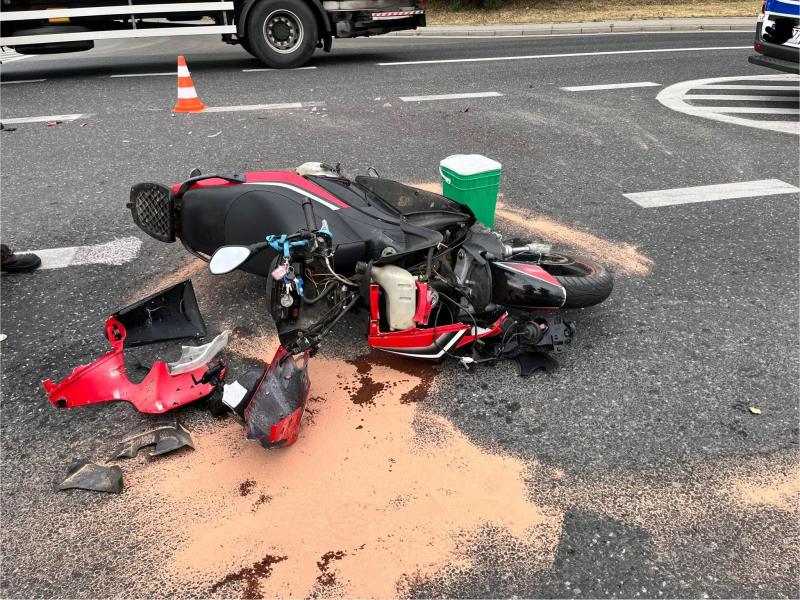 Czerwono-czarny skuter uległ poważnym uszkodzeniom – jego przednia część została całkowicie zniszczona. Uszkodzony został również turkusowy nissan, na którym widać szereg wgnieceń z boku pojazdu. Siła uderzenia spowodowała również oderwanie zderzaka.