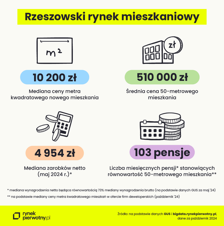 Mało kto może pozwolić sobie na zakup 50-metrowego mieszkania za gotówkę. Zaoszczędzenie tak dużej kwoty wymaga wiele wysiłku i w przypadku przeciętnego mieszkańca Rzeszowa zajęłoby osiem lat i siedem miesięcy. I to pod warunkiem, że do skarbonki trafiłaby cała pensja, czyli miesięcznie 4 954 zł, bo tyle wynosi w Rzeszowie mediana zarobków netto (eksperci portalu RynekPierwotny.pl wyliczyli ją jako 73 proc. mediany zarobków brutto, na podstawie danych GUS za maj 2024 roku).