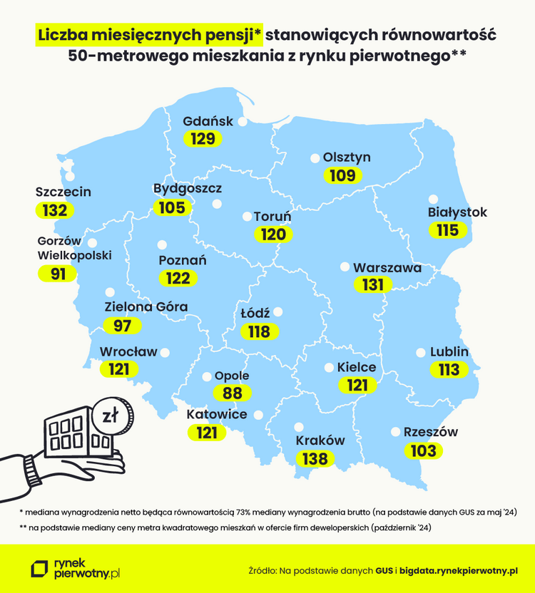 Siła nabywcza kupujących na rynku mieszkaniowym jest w poszczególnych miastach mocno zróżnicowana. Z wyliczeń ekspertów portalu RynekPierwotny.pl wynika, że najkorzystniejszym stosunkiem cen mieszkań do zarobków charakteryzują się Opole, a także Gorzów Wielkopolski i Zielona Góra. W Opolu na lokum o powierzchni 50 m kw. trzeba pracować średnio 88 miesięcy, czyli ponad siedem lat.