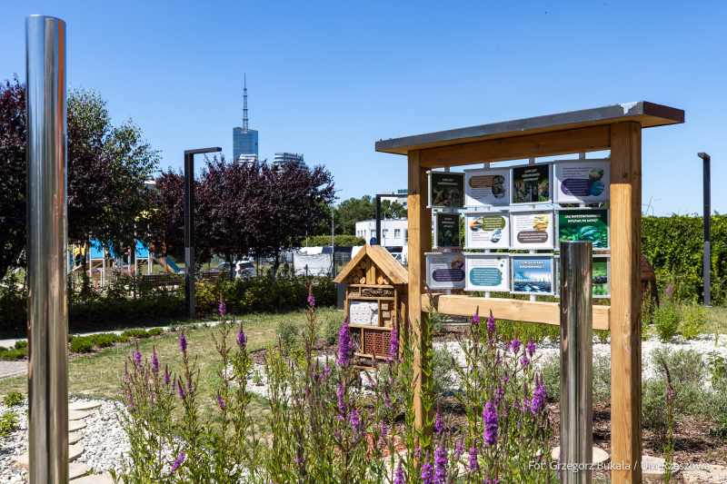 Całość uzupełnia oświetlenie solarne i nawierzchnia wodoprzepuszczalna. Nasadzenia obejmują 1,2 tys. bylin, ponad 3,2 tys. krzewów, pnącza, łąkę kwietną oraz ponad 50 drzew i trawniki.