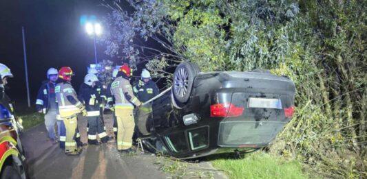 Zjechał z drogi i dachował. 29-letni kierowca audi z obrażeniami trafił do szpitala