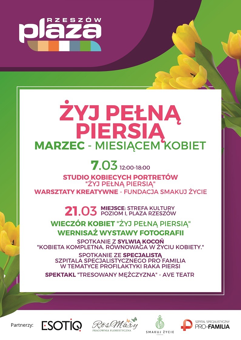 Studio Kobiecych Portretów z wernisażem wystawy oraz Wieczór Kobiet z poradami specjalisty profilaktyki raka piersi i spektaklem „Tresowany Mężczyzna” – to propozycje dla wszystkich pań zaplanowane na marzec przez CH Plaza Rzeszów. Wydarzenie wprowadzające pod hasłem „Studio Kobiecych Portretów – Żyj pełną piersią!” odbędzie się już 7 marca . Kolejne, czyli Wieczór Kobiet, w sobotę, 21 marca.